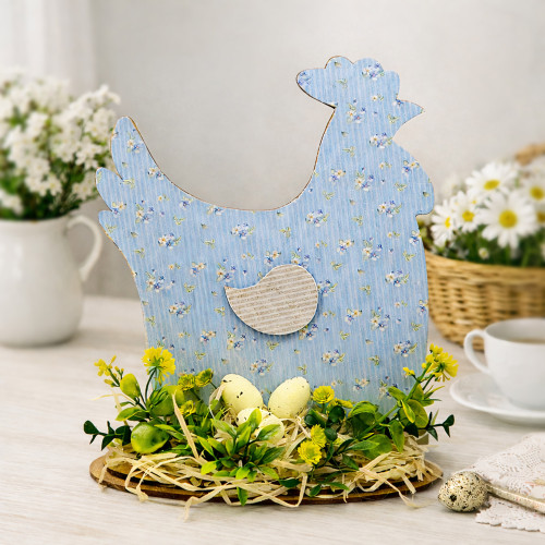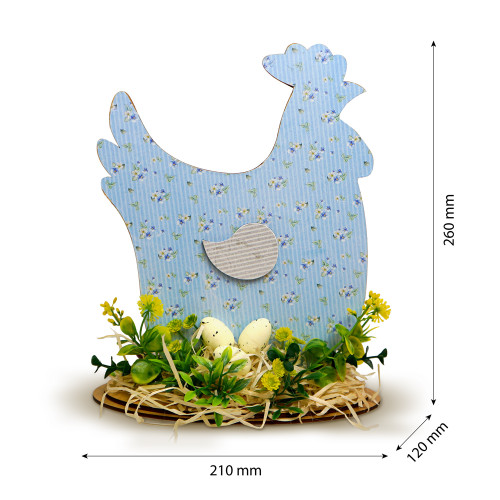 Інтер'єрна декоративна композиція «Пасхальна Курочка» — готова настільна композиція з милою курочкою та об'ємним флористичним декором, яка миттєво наповнює простір світлим весняним настроєм і передчуттям Великодня. Виріб повністю готовий до використання: достатньо встановити фігурку на здвоєну підставку з МДФ, що входить у комплект.