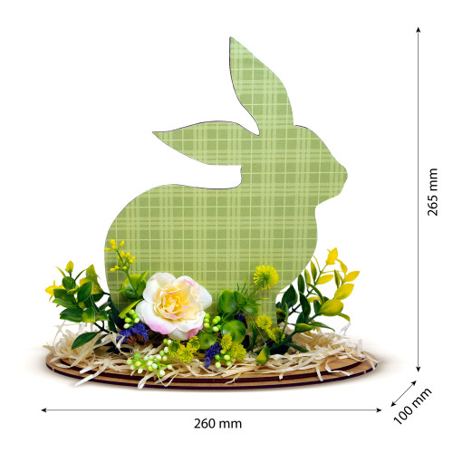 Фігурка кролика виконана з міцного ХДФ товщиною 3 мм і оформлена кольоровим папером з ніжним весняним принтом. Основання прикрашене реалістичними штучними квітами з мильної пінки та декоративною зеленню, що створюють м'яке, затишне і святкове обрамлення. Усі елементи надійно зафіксовані і зберігають акуратний вигляд при дбайливому використанні.