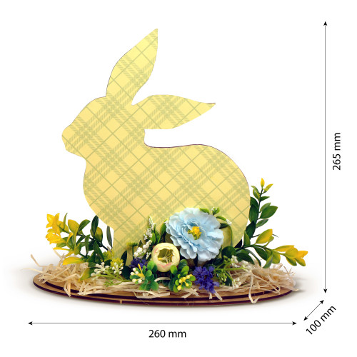 Фігурка кролика виконана з міцного ХДФ товщиною 3 мм і оформлена кольоровим папером з ніжним весняним принтом. Основання прикрашене реалістичними штучними квітами з мильної пінки та декоративною зеленню, що створюють м'яке, затишне і святкове обрамлення. Усі елементи надійно зафіксовані і зберігають акуратний вигляд при дбайливому використанні.
