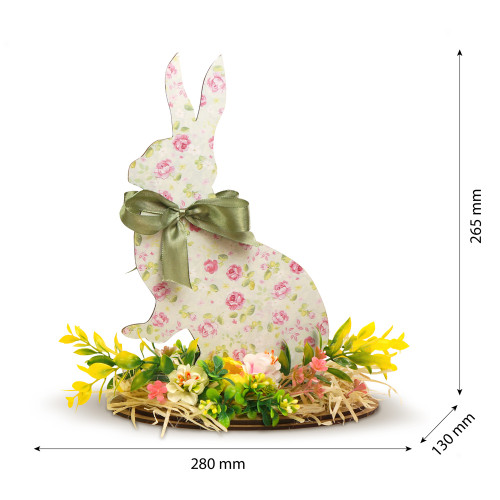 Фігурка кролика виконана з міцного ХДФ товщиною 3 мм і оформлена кольоровим папером з ніжним весняним принтом. Основання прикрашене реалістичними штучними квітами з мильної пінки та декоративною зеленню, що створюють м'яке, затишне і святкове обрамлення. Усі елементи надійно зафіксовані і зберігають акуратний вигляд при дбайливому використанні.