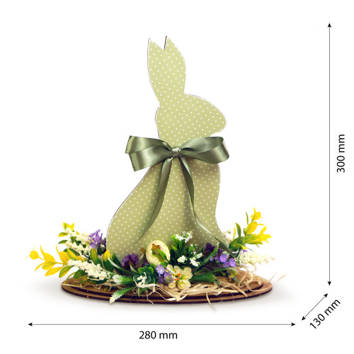 Фігурка кролика виконана з міцного ХДФ товщиною 3 мм і оформлена кольоровим папером з ніжним весняним принтом. Основання прикрашене реалістичними штучними квітами з мильної пінки та декоративною зеленню, що створюють м'яке, затишне і святкове обрамлення. Усі елементи надійно зафіксовані і зберігають акуратний вигляд при дбайливому використанні.