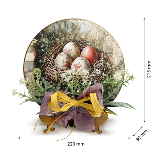 Кругла основа з міцного ХДФ товщиною 3 мм прикрашена декоративним зображенням у стилі великоднього натюрморту. Композиція доповнена текстильними елементами та флористичними акцентами, які створюють акуратний об'єм і живу, теплу атмосферу свята. Стійка підставка з ламінованого ХДФ забезпечує стабільність і зручне розміщення.
