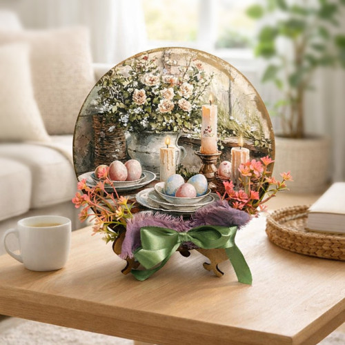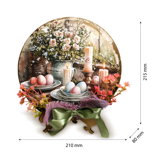 Кругла основа з міцного ХДФ товщиною 3 мм прикрашена декоративним зображенням у стилі великоднього натюрморту. Композиція доповнена текстильними елементами та флористичними акцентами, які створюють акуратний об'єм і живу, теплу атмосферу свята. Стійка підставка з ламінованого ХДФ забезпечує стабільність і зручне розміщення.