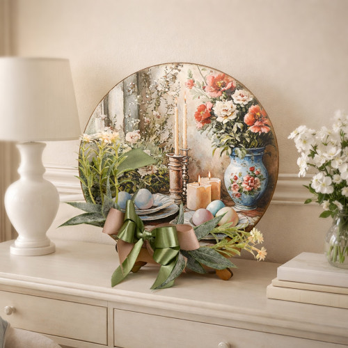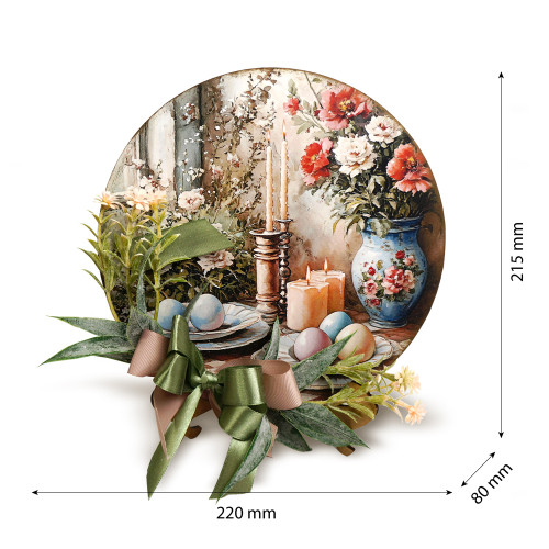 Кругла основа з міцного ХДФ товщиною 3 мм прикрашена декоративним зображенням у стилі великоднього натюрморту. Композиція доповнена текстильними елементами та флористичними акцентами, які створюють акуратний об'єм і живу, теплу атмосферу свята. Стійка підставка з ламінованого ХДФ забезпечує стабільність і зручне розміщення.