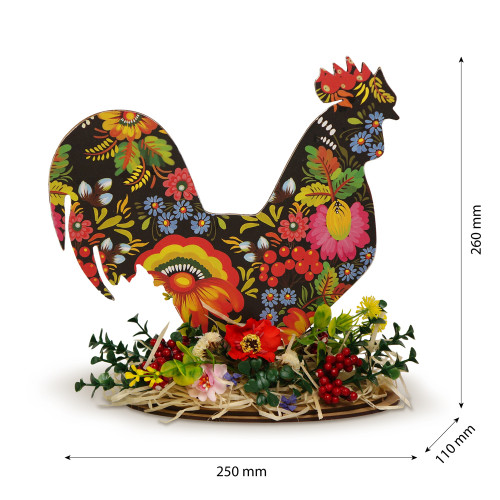 Інтер'єрна декоративна композиція «Петриківський півник» №07 — яскрава готова настільна композиція в традиційному петриківському стилі, яка наповнює простір весняним настроєм і святковою великодньою атмосферою. Виріб повністю готовий до використання: достатньо встановити фігурку півника на стійку підставку з ХДФ, що входить у комплект.