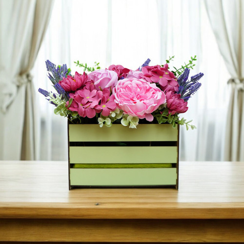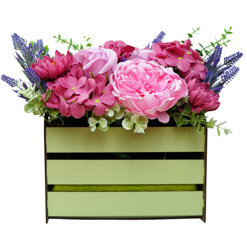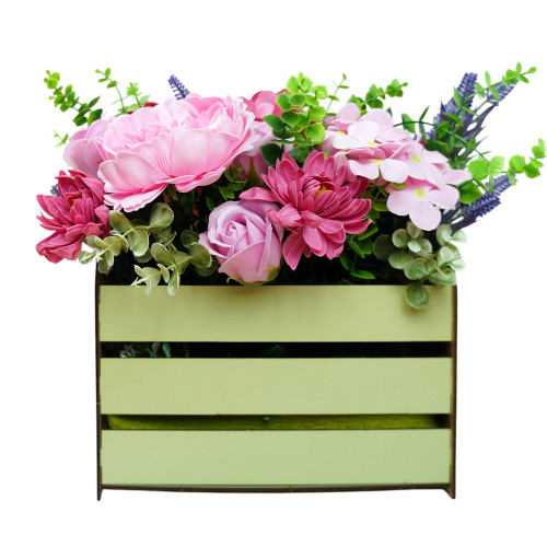 Квіти розміщені у дерев’яній кошичці ніжного салатового кольору, яка додає композиції природності та шарму. Мильні квіти не в’януть, не потребують догляду й залишаються красивими до 5 років. Це ідеальний подарунок або елемент декору для дому, офісу чи свята.