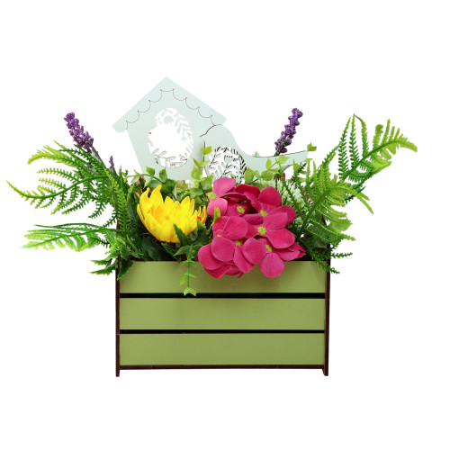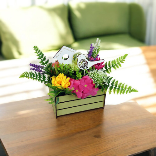 Квіти розміщені у дерев’яній кошичці ніжного салатового кольору, доповненій декоративними елементами — пташкою та шпаківнею, що символізують затишок і весняне пробудження. Лаванда, зелень і гіпсофіла створюють атмосферу природності й легкості.