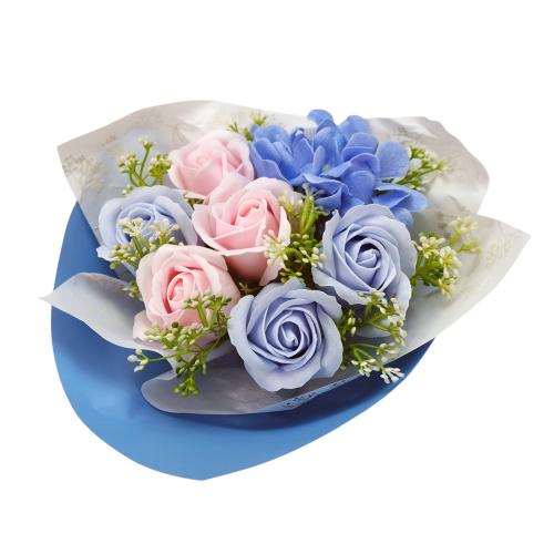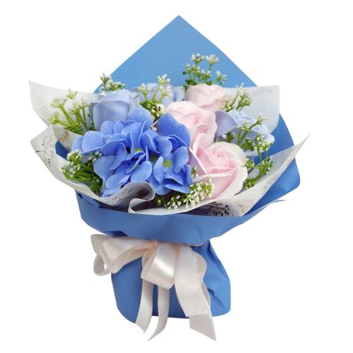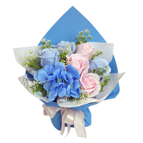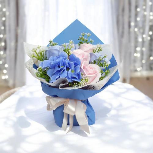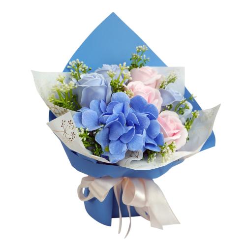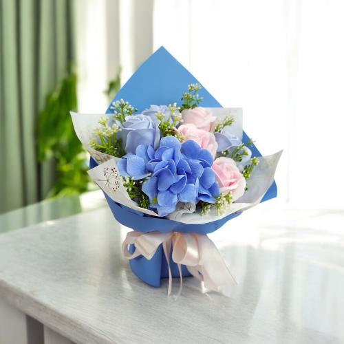 «Літній бриз» — це букет, де свіжість блакитної гортензії поєднується з ніжністю рожевих і лавандових троянд. Композиція оформлена у стильну упаковку небесного відтінку та стане елегантною прикрасою будь-якого простору або оригінальним подарунком на будь-яке свято. Усі квіти виготовлені з гіпоалергенної мильної пінки, яка виглядає та відчувається як справжні пелюстки, не потребує догляду й зберігає красу до 5 років.