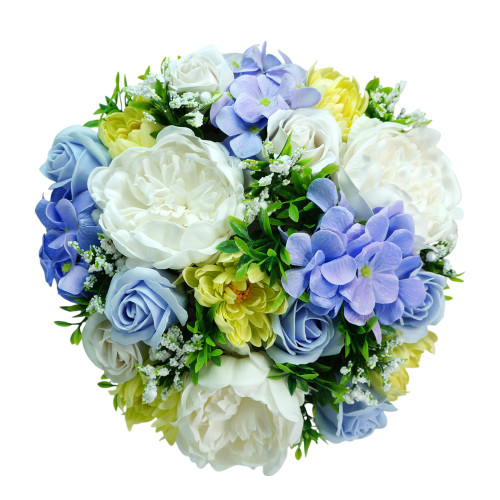 Композиція «Голубий Шарм» — це втілення ніжності, витонченості та спокою. Елегантний букет із мильних квітів поєднує небесно-блакитні, білі та жовті відтінки, створюючи гармонійний і свіжий настрій. Така композиція стане чудовим подарунком або витонченим декором для дому.