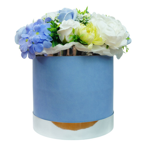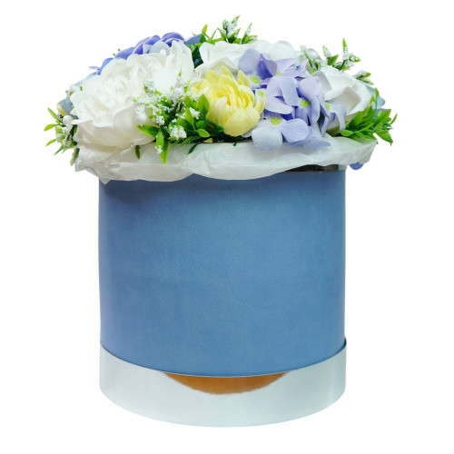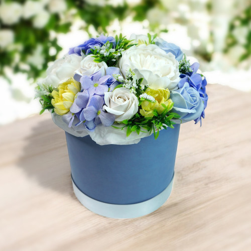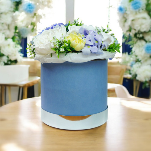 Мітки: Композиція Блакитний шарм із квітами з мильної пінки у капелюшній коробці, 250x250x300 мм