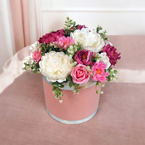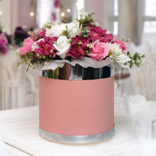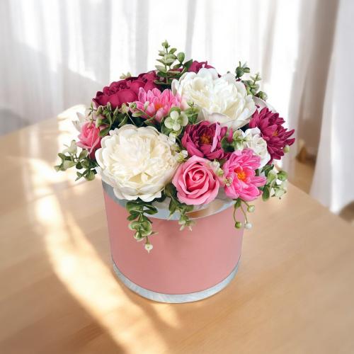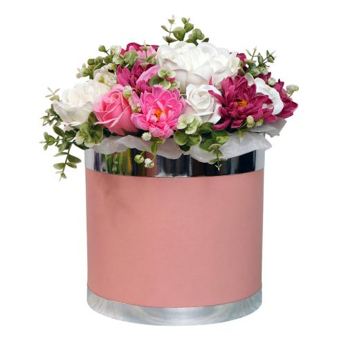 Композиція «Магія Кохання» — це поєднання розкоші, елегантності та щирих почуттів. Пишні півонії, троянди, хризантеми й гортензії, створені з мильної піни, виглядають як живі й зберігають свою красу роками. Ніжно-рожева капелюшна коробка з сріблястим кантом додає витонченості й робить композицію готовим подарунком, який не потребує додаткового пакування.
