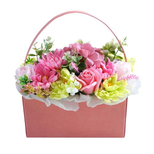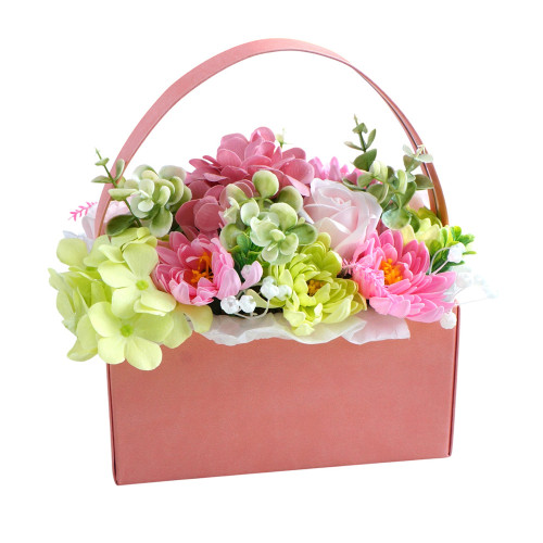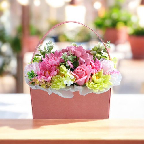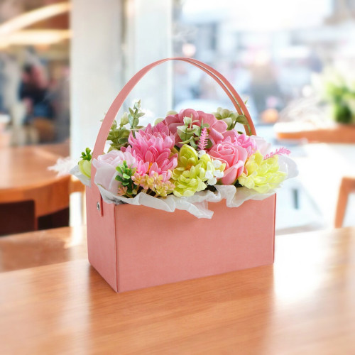 Композиція «Персикова елегія» — це втілення ніжності, витонченості та гармонії. Букет із мильних квітів у дизайнерській коробці-сумочці поєднує теплі персикові, рожеві та світло-зелені відтінки, створюючи відчуття затишку, легкості та спокою. Така композиція стане чудовим подарунком або стильним елементом декору.