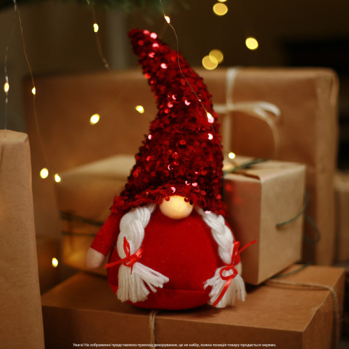 Мітки: Новорічна м'яка іграшка Novogodko Гном Дівчинка, червона паєтка, 29 см, LED ніс
