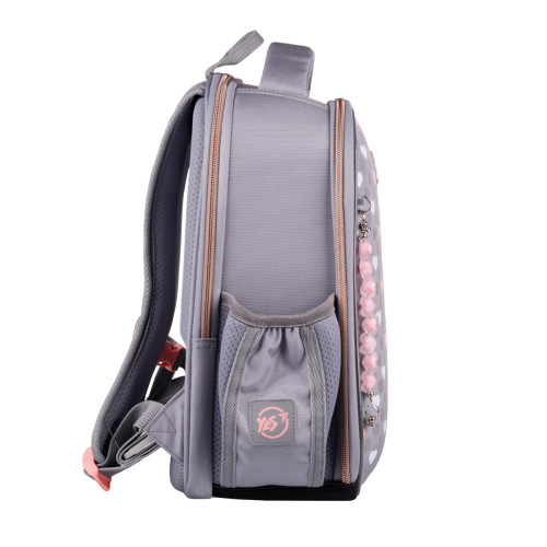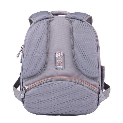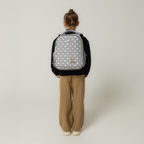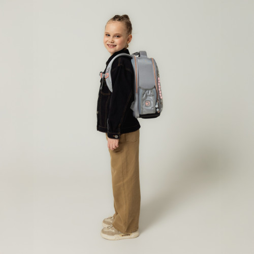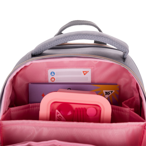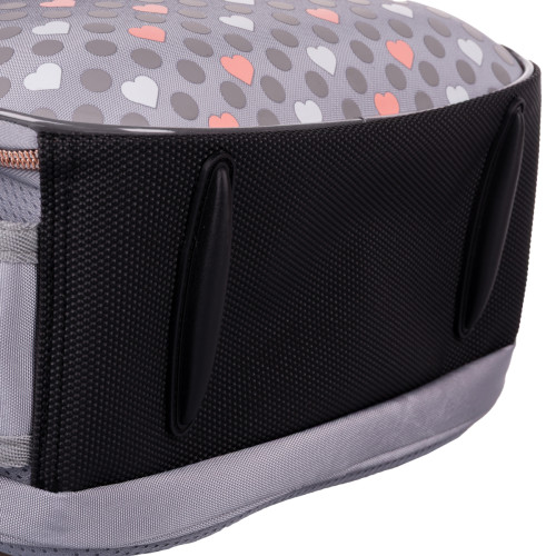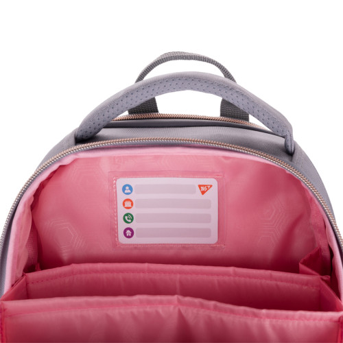S-подібні анатомічні лямки зменшують навантаження на плечі, а нагрудний ремінець фіксує рюкзак у правильному положенні. Посилене дно з прорезиненим покриттям гарантує захист від бруду та вологи. Ніжна комбінація рожевого та сірого кольорів, трендовий патерн і напис із ефектом «фольга» роблять рюкзак стильним та привабливим.