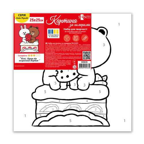 Подаруйте дитині можливість відчути себе справжнім художником! Навіть якщо малюк уперше бере до рук пензлик, картина за номерами SANTI Line Friends допоможе створити власний яскравий шедевр без спеціальної підготовки.