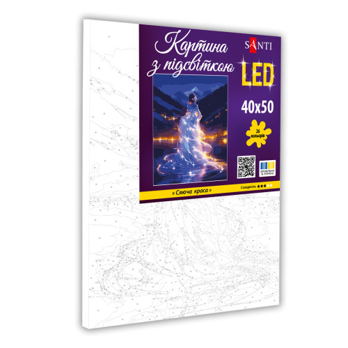 Картина за номерами SANTI з LED-підсвіткою — це можливість створити живописний шедевр без спеціальної підготовки. Слідуючи пронумерованим контурам на полотні та використовуючи якісні акрилові фарби, ви легко відтворите дивовижний сюжет. А вбудовані LED-елементи нададуть картині чарівного ефекту, перетворюючи її на витвір мистецтва, що світиться!