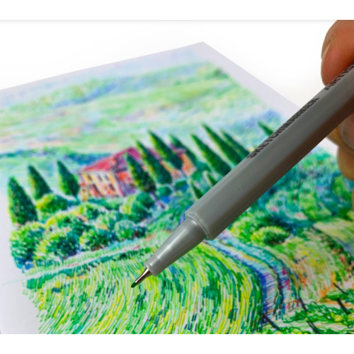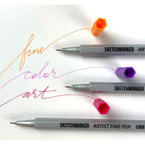 SKETCHMARKER ARTIST FINE PEN - профессиональные высококачественные капиллярные ручки с тонким наконечником 0.4 мм. Прекрасно подойдут для скетчинга, совместного использования с маркерами (в том числе и спиртовыми), карандашами, для деталировки готовых работ, летерринга, графики, декорирования. Эргономичная шестигранная форма корпуса не позволяет ручкам скатываться с рабочих поверхностей. Палитра состоит из 60 цветов: 8 флуоресцентных оттенков и 52 базовых (от светлых, пастельных оттенков до глубоких ярких тонов). Пигментные чернила на водной основе высыхают мгновенно, поэтому не расплываются и не проступают сквозь бумагу. Ручки длительное время не высыхают без колпачка. Чернила безвредны, сертифицированы и соответствуют стандартам безопасности и качества: европейским - EN71-3, американским - ASTM D-4236 (LHAMA Certification).