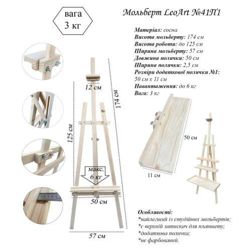 Студійний мольберт АРТ-41П1 LeoArt — чудовий вибір для художників, яким важлива функціональність, комфорт та надійність під час роботи.