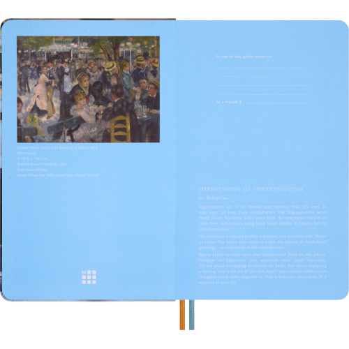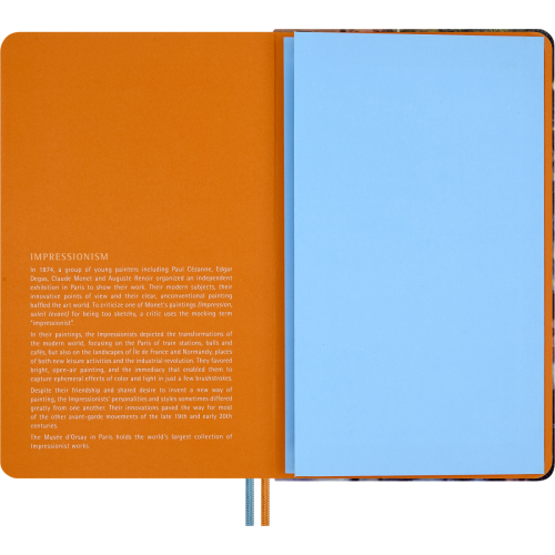 Записник Moleskine Impressionism середній у лінію — це втілення сміливого духу імпресіоністів у сучасному щоденному інструменті. Колекція натхненна революційним підходом художників, які відкинули суворі правила та віддали перевагу експресивним мазкам, миттєвим враженням і емоціям. Широкі кольорові хвилі на обкладинці передають свіже прочитання вічних шедеврів імпресіонізму, запрошуючи вас порушувати правила та довіряти інтуїції.