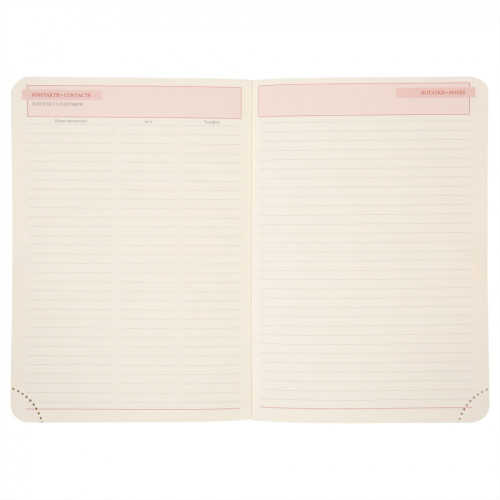 Паперовий блок містить 352 сторінки з щільного кремового офсету 80 г/м², що гарантує комфортне письмо без просвічування. Перфоровані куточки та заокруглені краї допомагають зберігати акуратний вигляд, а кольоровий зріз додає вишуканого акценту. Додаткові календарі, карти та довідкові матеріали роблять планування ще зручнішим.