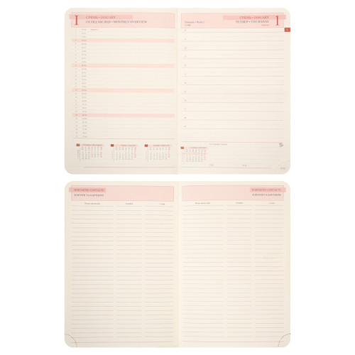 Внутрішній блок містить 368 сторінок із кремового офсету 80 г/м², зручного для письма ручкою чи олівцем без просвічування. Перфоровані куточки допомагають швидко знаходити актуальний день, а заокруглені краї захищають сторінки від зношування. Зріз у тон блоку створює гармонійний мінімалістичний вигляд. Додаткові календарі, карти та довідковий блок роблять щоденник максимально функціональним.