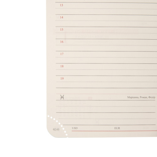 Внутрішній блок із 368 сторінок кремового офсету щільністю 80 г/м² ідеально підходить для письма ручкою чи олівцем. Перфоровані куточки дозволяють легко позначати актуальну сторінку, а заокруглені краї захищають аркуші від зношування. Кольоровий зріз додає сучасного дизайнерського акценту, а календарі, карти та довідковий блок роблять щоденник ще більш функціональним.