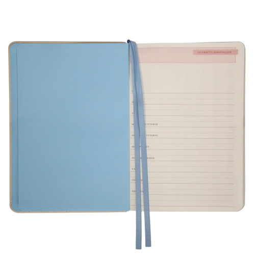Блок складається з 320 кремових сторінок щільністю 80 г/м², які не просвічують і комфортні для очей. Закруглені кути захищають сторінки від швидкого зношування, а кольоровий зріз із дизайнерським принтом надає щоденнику особливого шарму. Усередині також є карти України та Європи, довідковий блок і додаткові сторінки для нотаток.