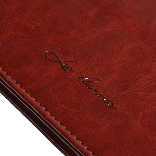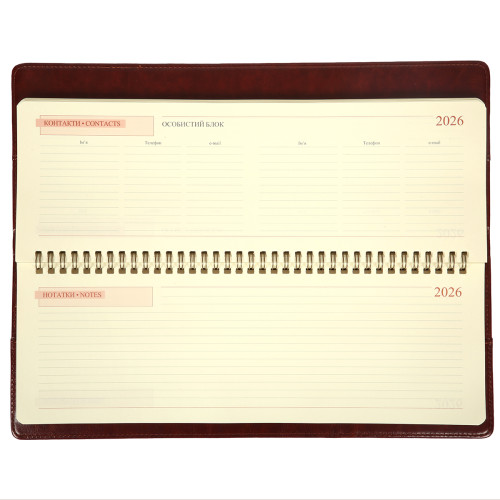 Тверда обкладинка з PU-матеріалу забезпечує захист і довговічність. Вона стійка до вологи та пилу, приємна на дотик і легко очищується. Декоративний шов додає вишуканості, а прихований під обкладинкою гребінь зберігає акуратний вигляд навіть за щоденного використання. Можливість персоналізації тисненням робить планінг індивідуальним.