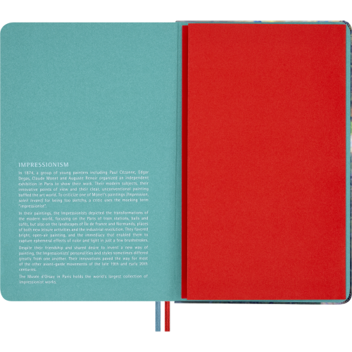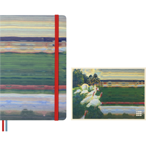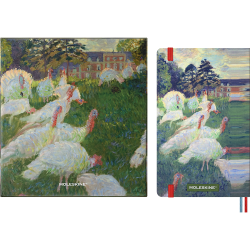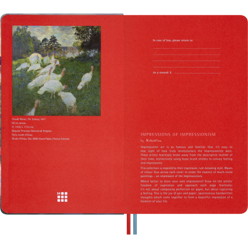 Обкладинка записника — яскрава, динамічна інтерпретація картини Клода Моне «Les Dindons», переосмислена через гру плавних кольорів і текстур. Всередині: 240 чистих кремових сторінок преміум-класу, закруглені кути, еластична червона застібка, закладка-стрічка в тон, розширювана внутрішня кишеня, набір наклейок і поле «In case of loss». Папір сертифікований FSC™ і виготовлений з матеріалів відповідально керованих лісів.