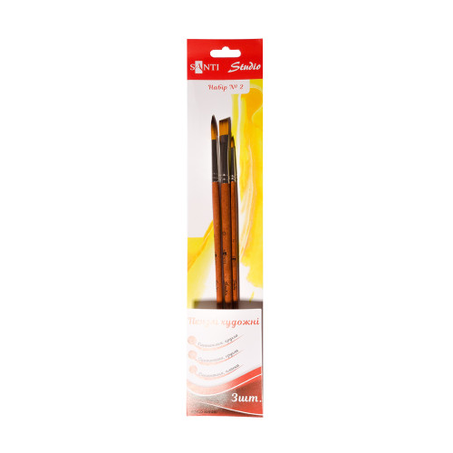 Набір художніх пензлів №2, синтетика, 3 шт. (плоский №10, круглі №2 і №8), коротка ручка, SANTI