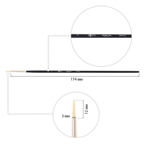 Пензлі з щетини «Santi Highly Pro» - прекрасний вибір серед кращих пензлів для масла і акрилу. Представлені на довгій ручці, захищеній матовим лаком. Відмінно підходять для роботи з усіма видами густої фарби. Туга, міцна щетина піддається обробці - кип‘ятиться та відбілюється і тільки білий ворс йде на виготовлення пензлів професійної якості. Слідом за пружністю, найважливішою характеристикою щетини є її розщеплений кінчик - він сприяє гарній наповненості пензя і рівному нанесенню фарби на поверхню основи.