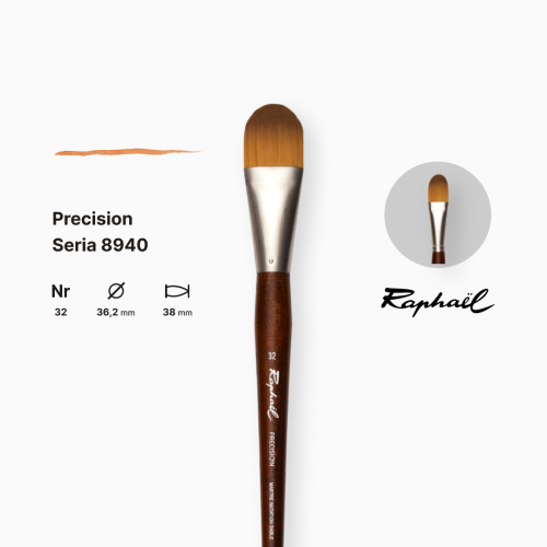 Професійний овальний синтетичний пензель Raphaël Precision Oval (серія 8404) — високоякісна імітація натурального колонка. Спеціально розроблений для акрилу, олії та гуаші, коли потрібні широкі мазки, м’які переходи, текстури та точна деталізація.