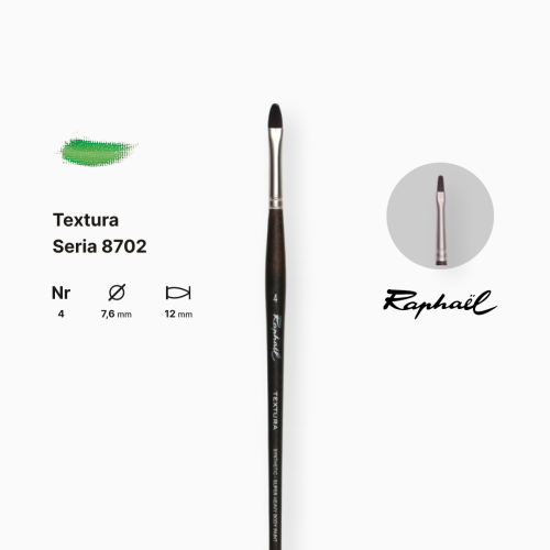 Професійний овальний синтетичний пензель Raphaël Textura Oval (серія 8404) — спеціальна розробка для акрилу, олії та гуаші. Створює виразні текстури, рельєфні мазки, ефекти сухого пензля та м’які переходи, зберігаючи при цьому відмінну пружність і контроль.