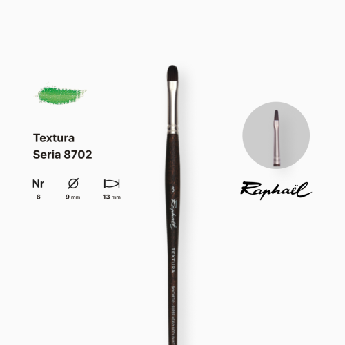 Професійний овальний синтетичний пензель Raphaël Textura Oval (серія 8404) — спеціальна розробка для акрилу, олії та гуаші. Створює виразні текстури, рельєфні мазки, ефекти сухого пензля та м’які переходи, зберігаючи при цьому відмінну пружність і контроль.